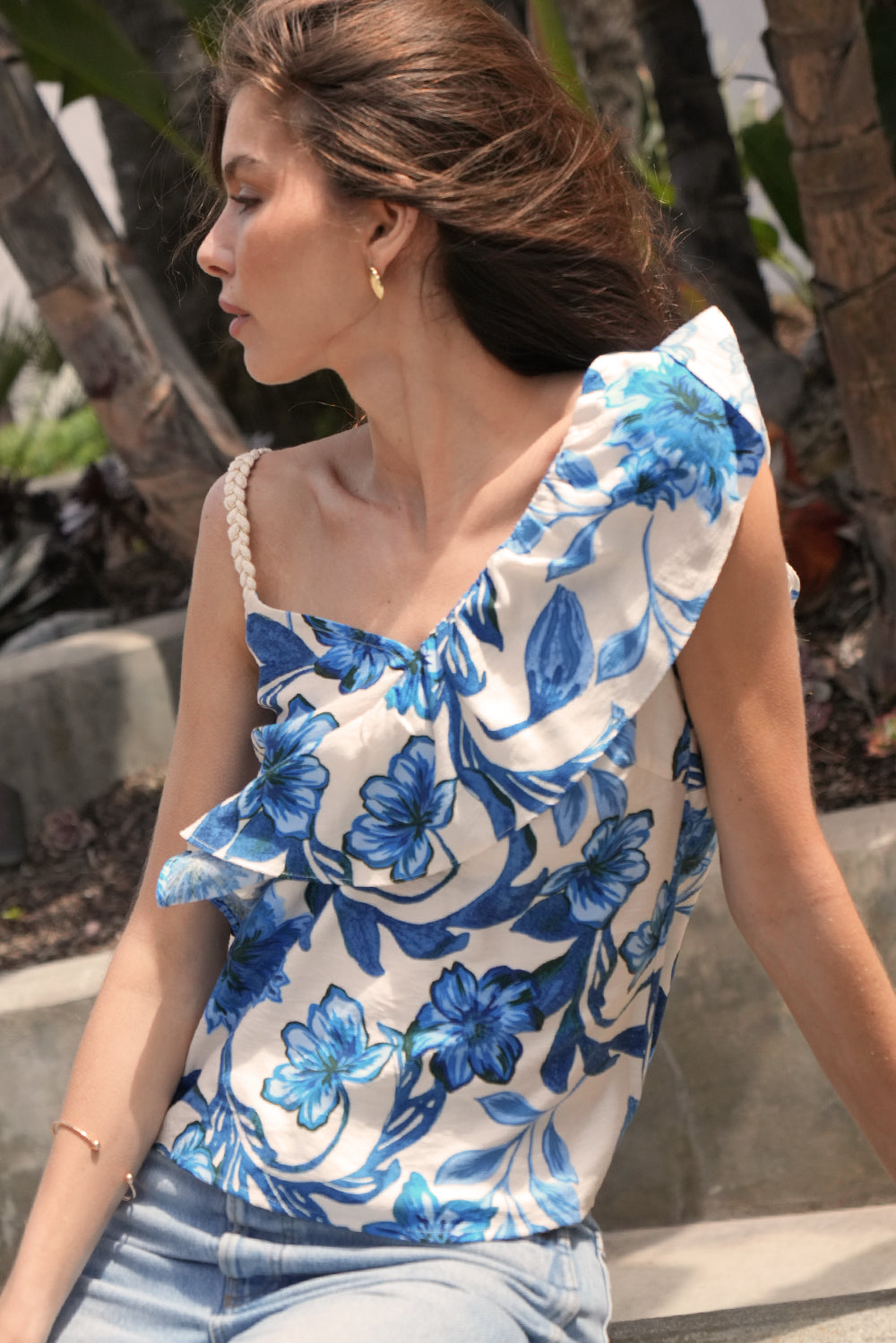 Bold blooms meet effortless glam. The Alina Top is cut from lightweight fabric in a vivid blue floral print that instantly sets the mood. Designed with a flattering asymmetrical neckline, ruffle detailing, and a braided shoulder strap for a touch of unexpected texture.