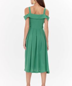 This off-shoulder dress features a button front closure and is adorned with a tie waist belt. Imagined in a green shade, easily wearable for relaxed occasions.