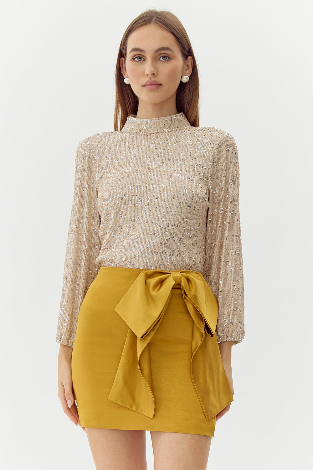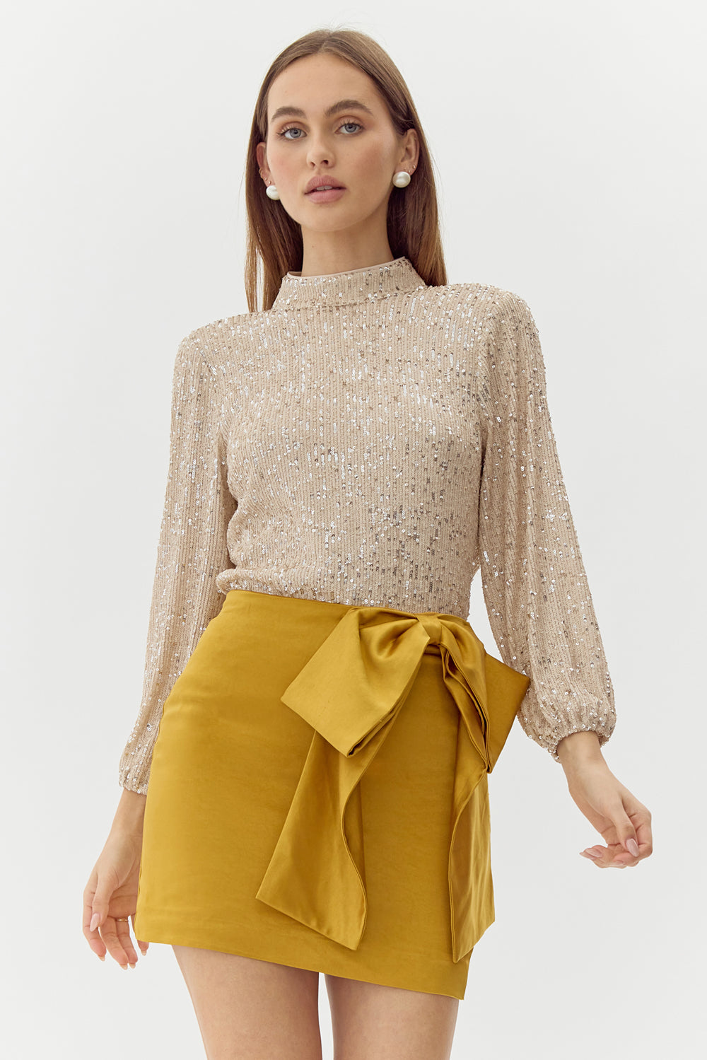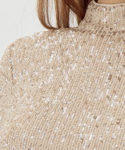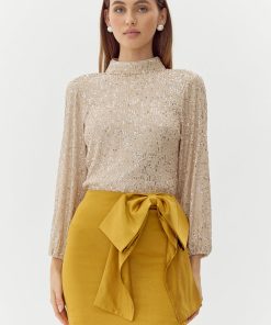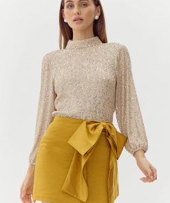 Turtleneck blouse decorated in champagne toned sequins. The back reveals a stunning exposed back with draping.