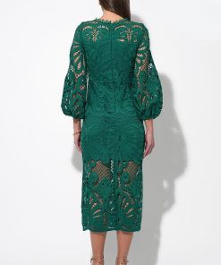 This captivating midi dress comes in a vibrant, eye-catching pink hue that radiates charm and confidence. It features a flattering V-neckline and exquisite puff sleeves crafted from delicate lace, adding a touch of romantic elegance.