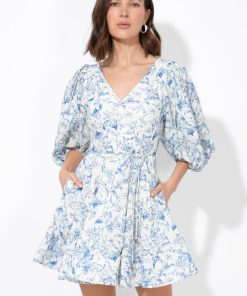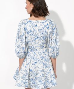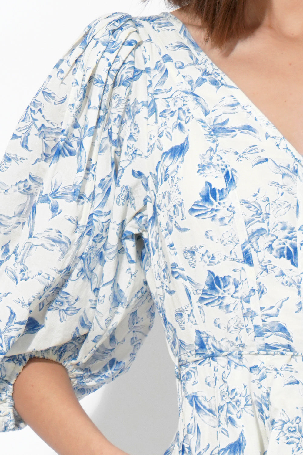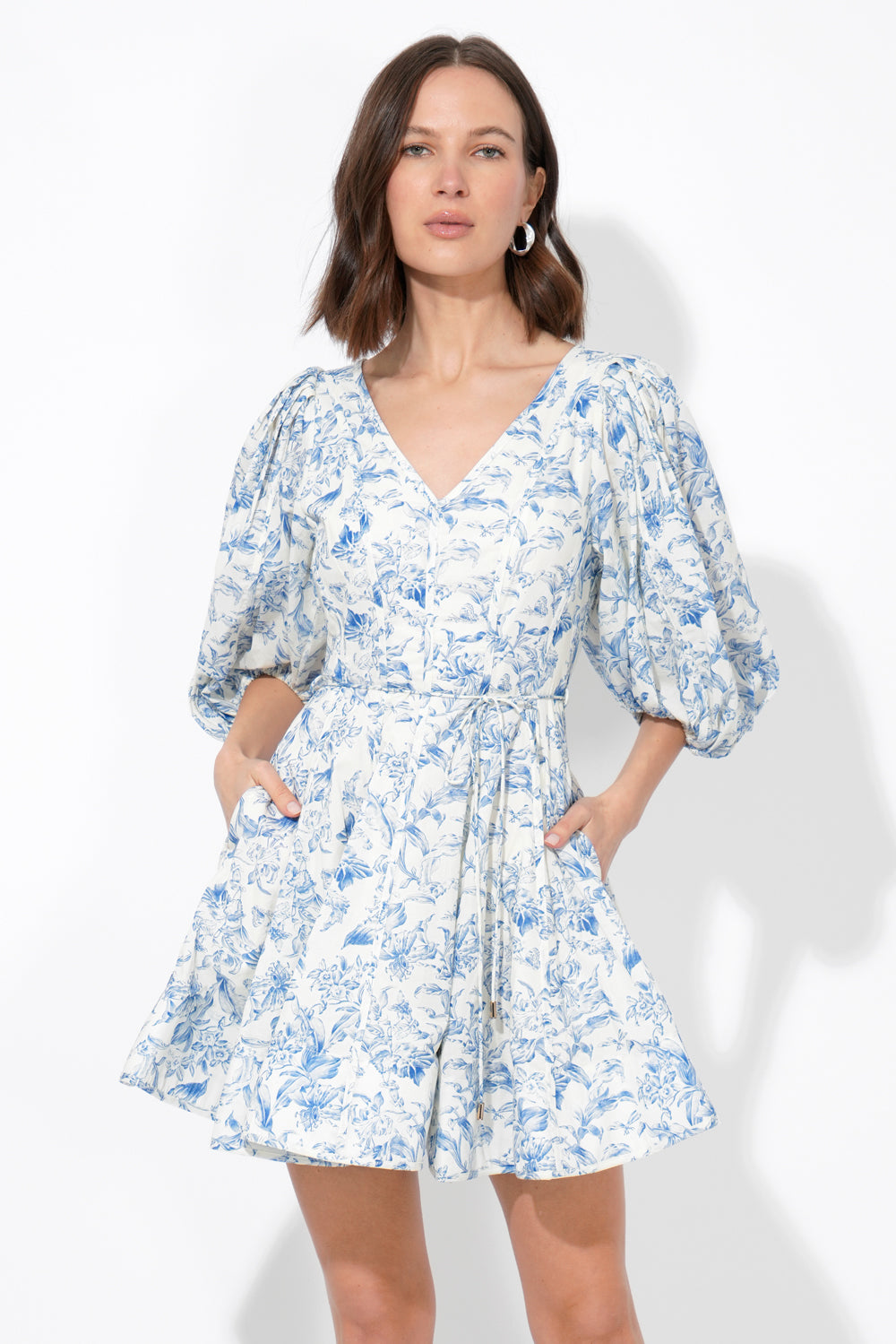 Featuring a dreamy blue and white floral print, this mini dress is all about timeless elegance with a playful twist. The voluminous balloon sleeves bring a touch of romance, while the cinched waist and flared skirt create the perfect fit-and-flare silhouette. Installed with a flattering V-neckline, a delicate tie belt, and hidden pockets.