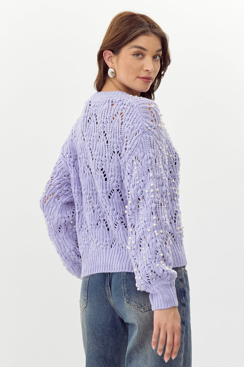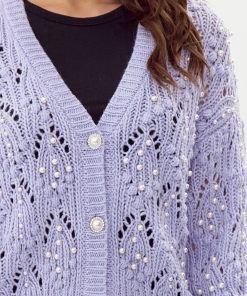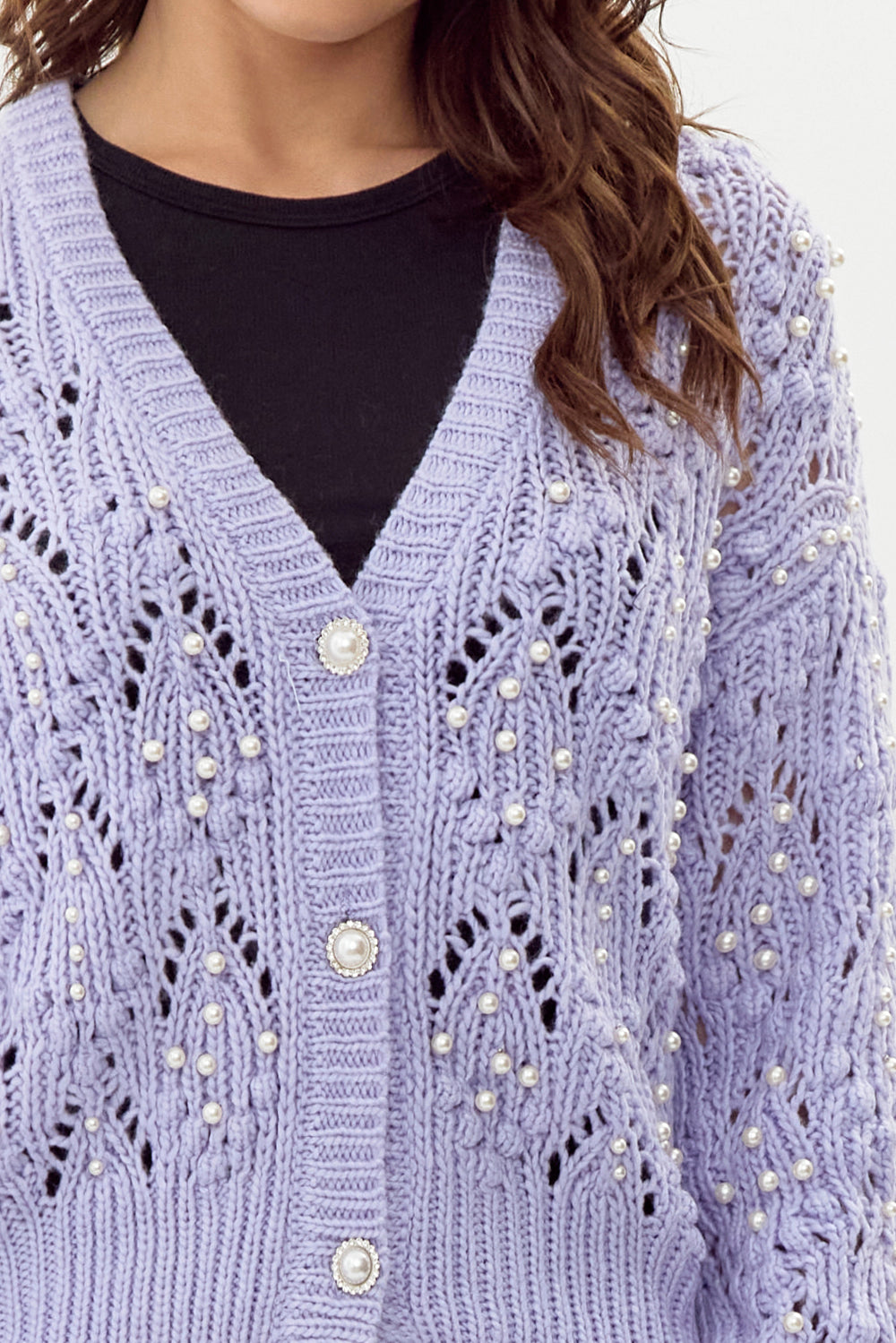 The Daniella Pearl Knit Cardigan is a classic open knit cardigan with beautiful pearl embellishments. Crafted with silver pearl buttons on top of a lavender design, this sweater is versatile for multiple settings.
