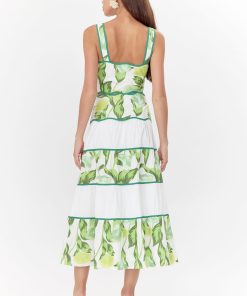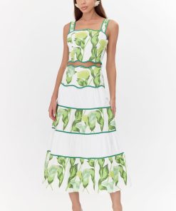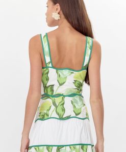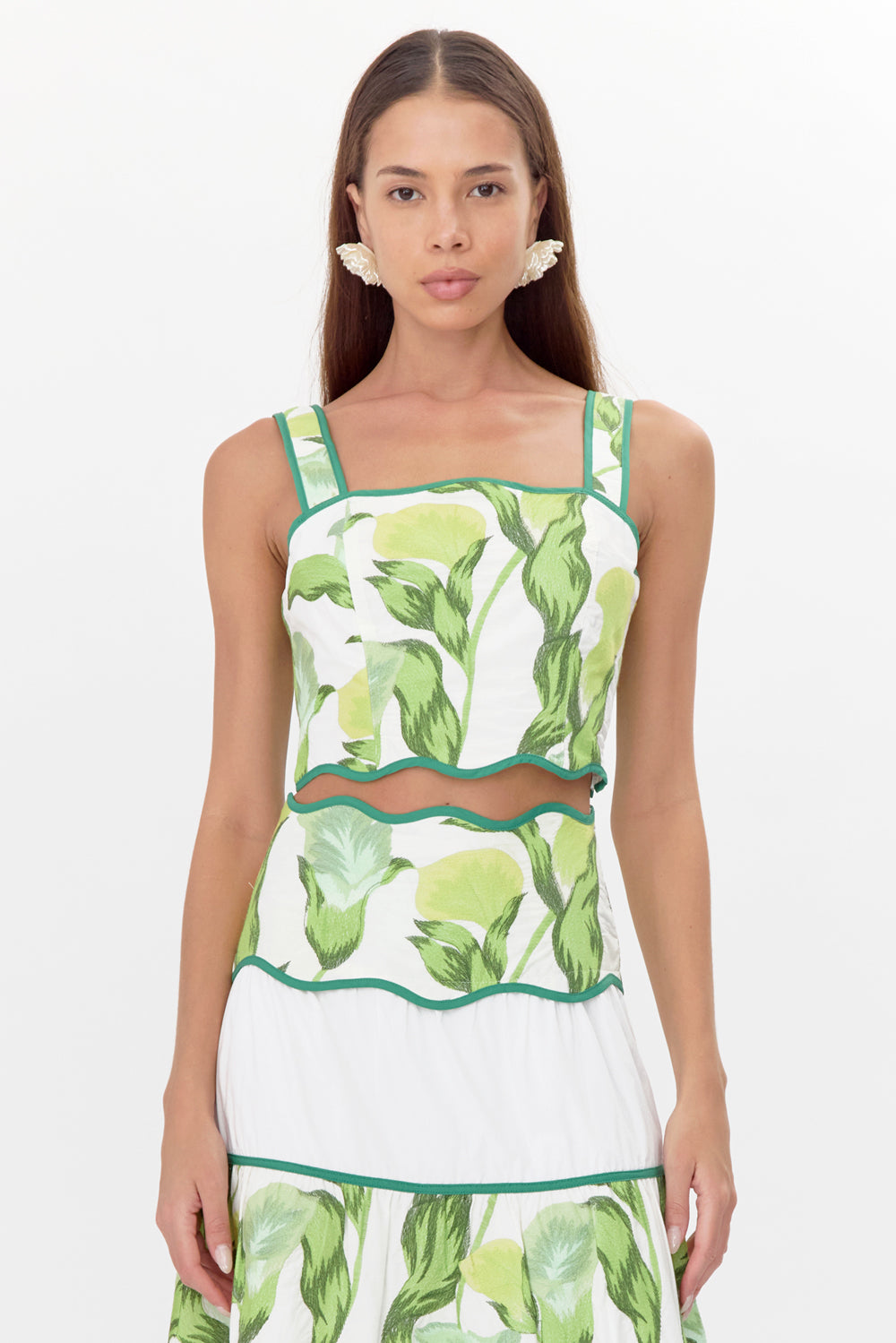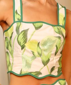 The “Daphne Crop Top” is defined by it’s soft floral print. Imagined in green and ivory shades, the top features a scallop trim and thick strap. As seen in images, it can be paired with the matching Daphne Skirt but you can easily mix and match with your favorite bottoms.