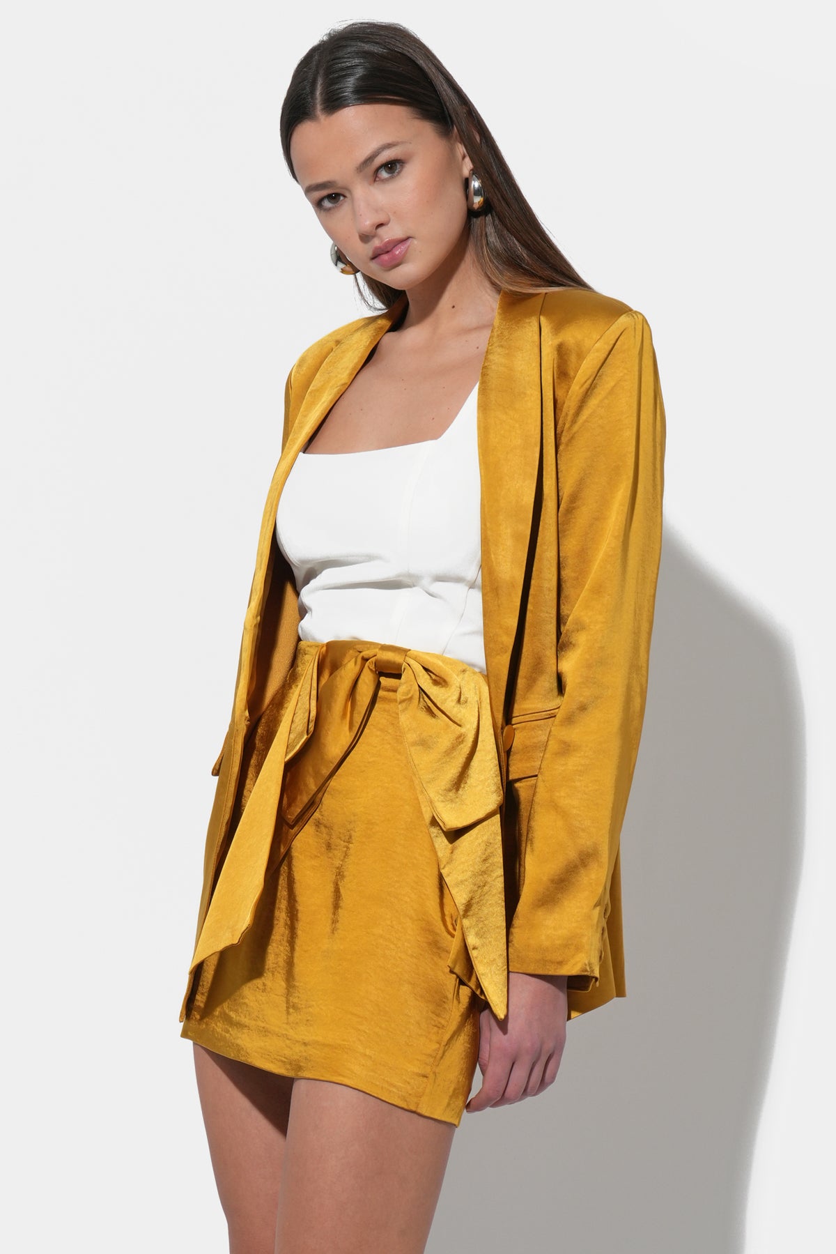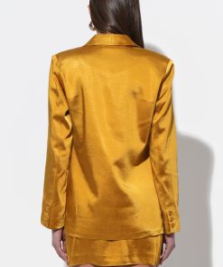 Crafted from sumptuous satin in a rich, captivating hue, this blazer exudes sophistication and modern elegance. It features classic notched lapels, a sleek single-button closure, and a perfectly tailored fit that flatters the silhouette.