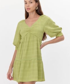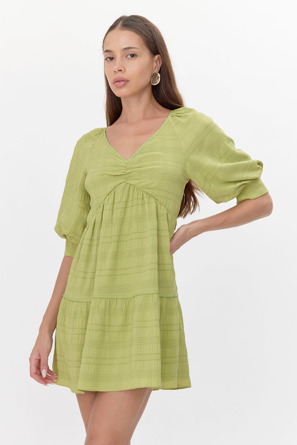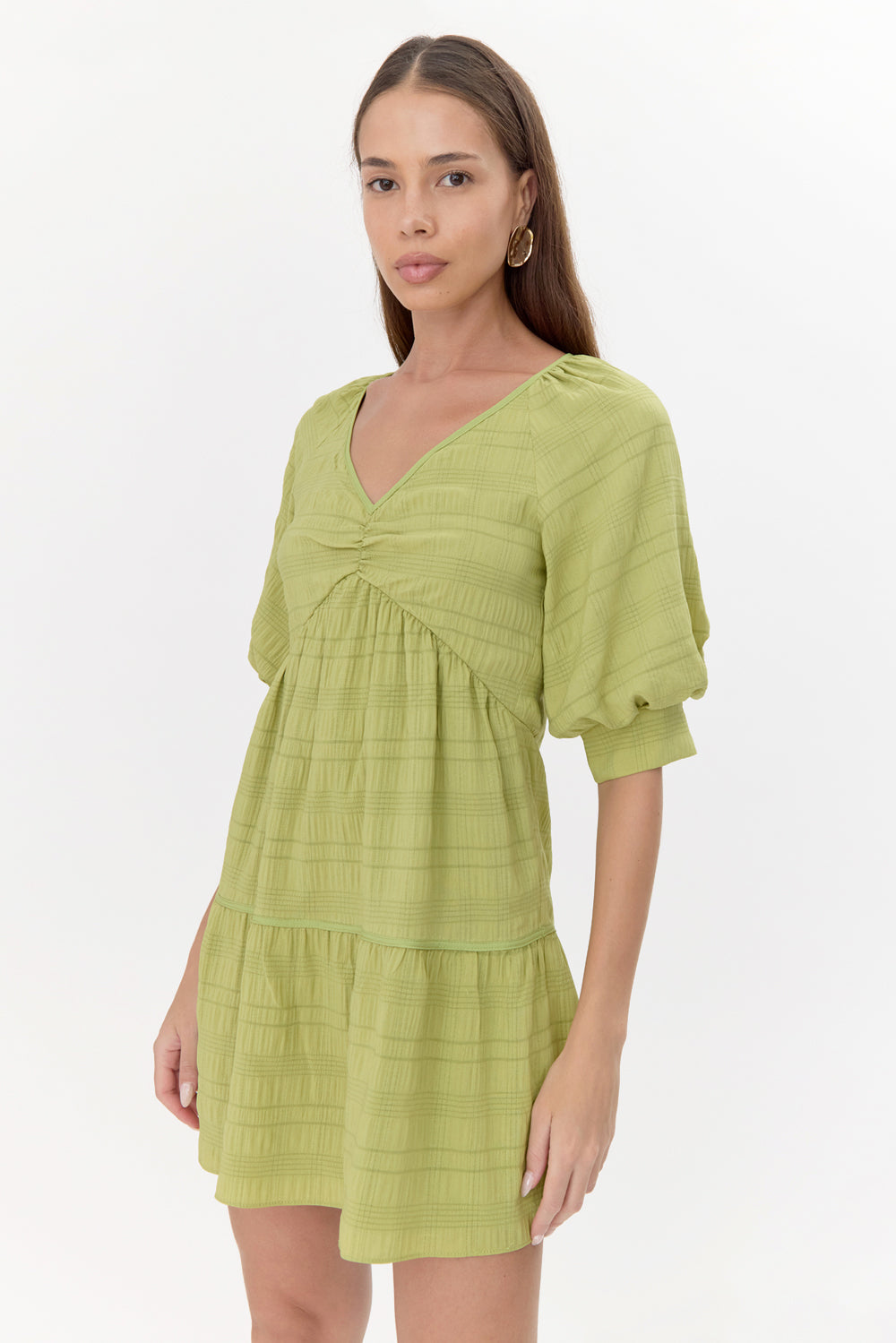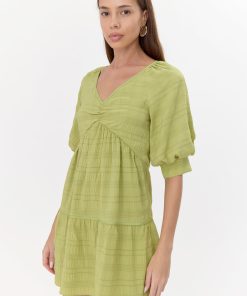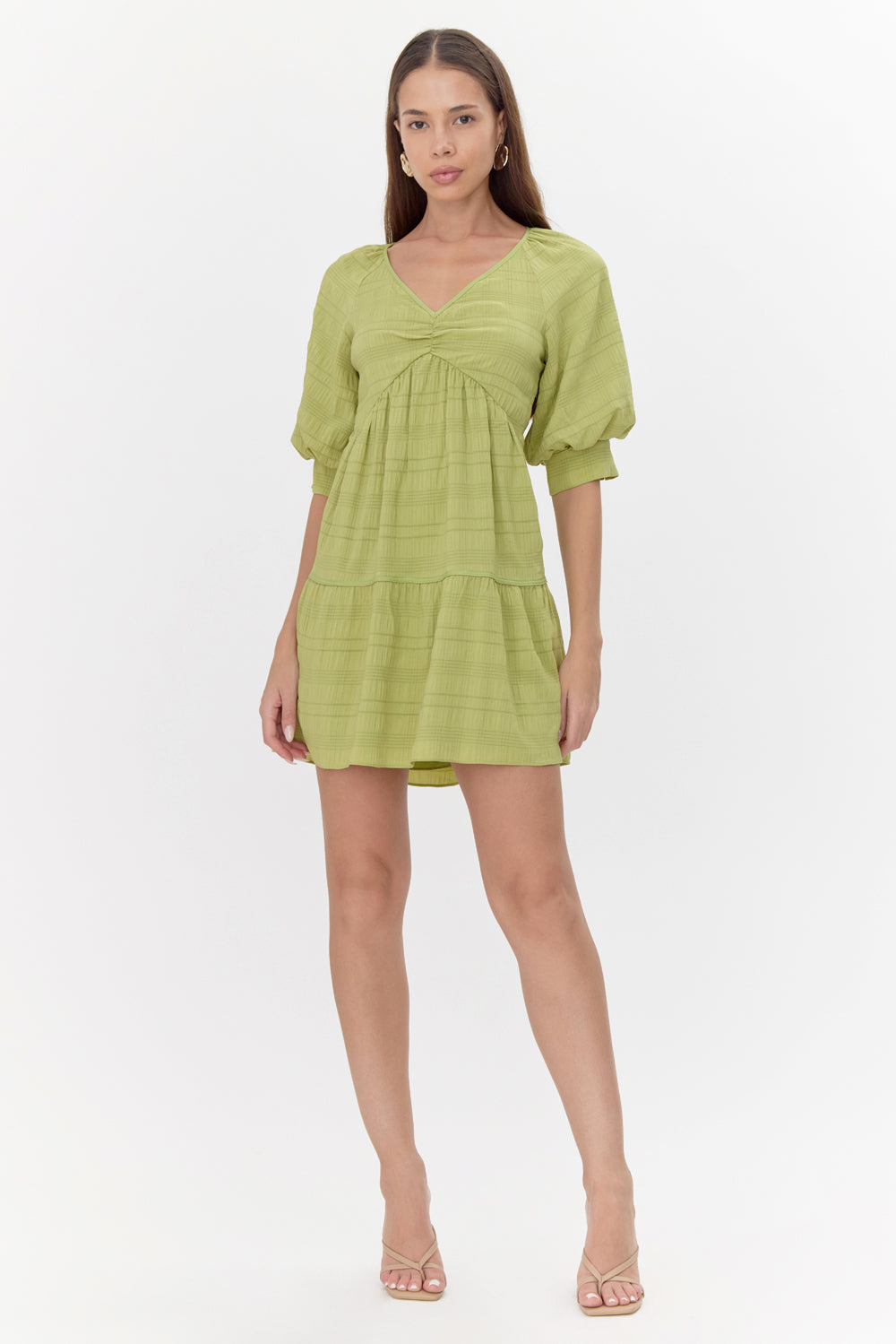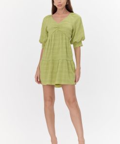 The “Dolores Dress” is structured as a baby doll dress, easy to pull over. It features short, puff sleeves detailed with buttoned cuffs and an empire waistline just below the chest. A V-neckline and tiered skirt finish the design.
