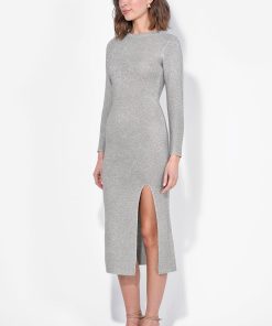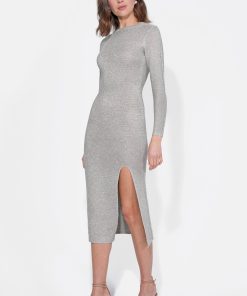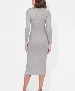 It is a midi-length dress crafted from a silver metallic knit fabric that shimmers subtly as it catches the light. The tiers of the skirt are made of a semi-sheer material, adding movement and an ethereal quality to the dress.