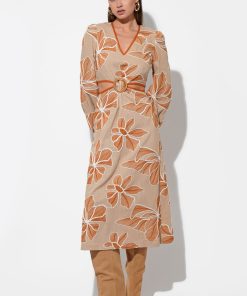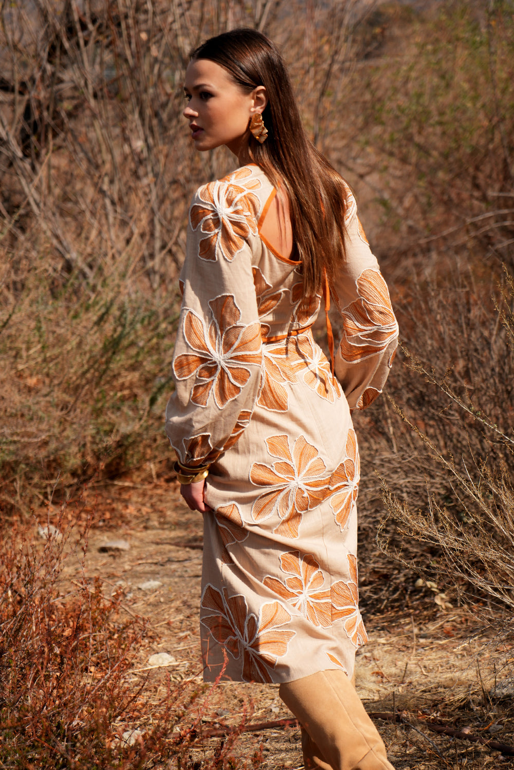 This stunning maxi dress, in a fresh white or cream hue, is adorned with delicate embroidery across the bodice and throughout the design, adding an artisanal touch. It features a flattering V-neckline and stylish puff sleeves with comfortable elasticated cuffs.