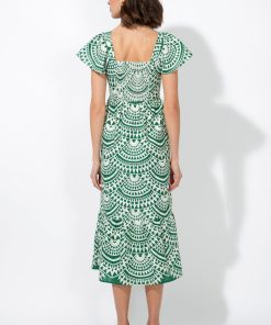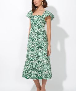 The Maja Crochet Dress is a perfect blend of effortless elegance and bohemian charm. Featuring a stunning geometric crochet print in vibrant green and ivory, this dress is designed for breezy sophistication. The square neckline and flutter sleeves add a romantic touch, while the smocked back ensures a comfortable fit.