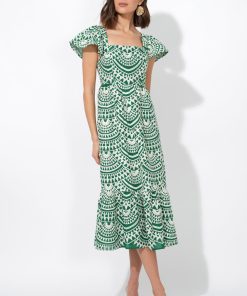 The Maja Crochet Dress is a perfect blend of effortless elegance and bohemian charm. Featuring a stunning geometric crochet print in vibrant green and ivory, this dress is designed for breezy sophistication. The square neckline and flutter sleeves add a romantic touch, while the smocked back ensures a comfortable fit.