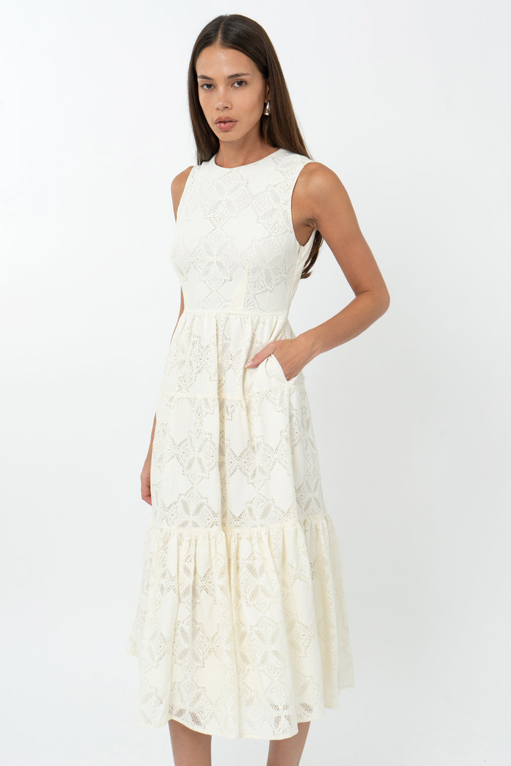 Sleeveless, lace dress that falls to a midi length. The structure features a tiered skirt along with hidden pockets. Slip into this piece effortlessly with a smock panel and button closure in the back.