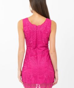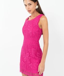 Sleeveless, lace dress with a floral pattern. Rendered in a deep pink, the garment falls to a short length and show’s off a classy structure that’s suitable for most special occasions.
