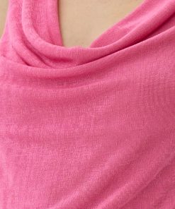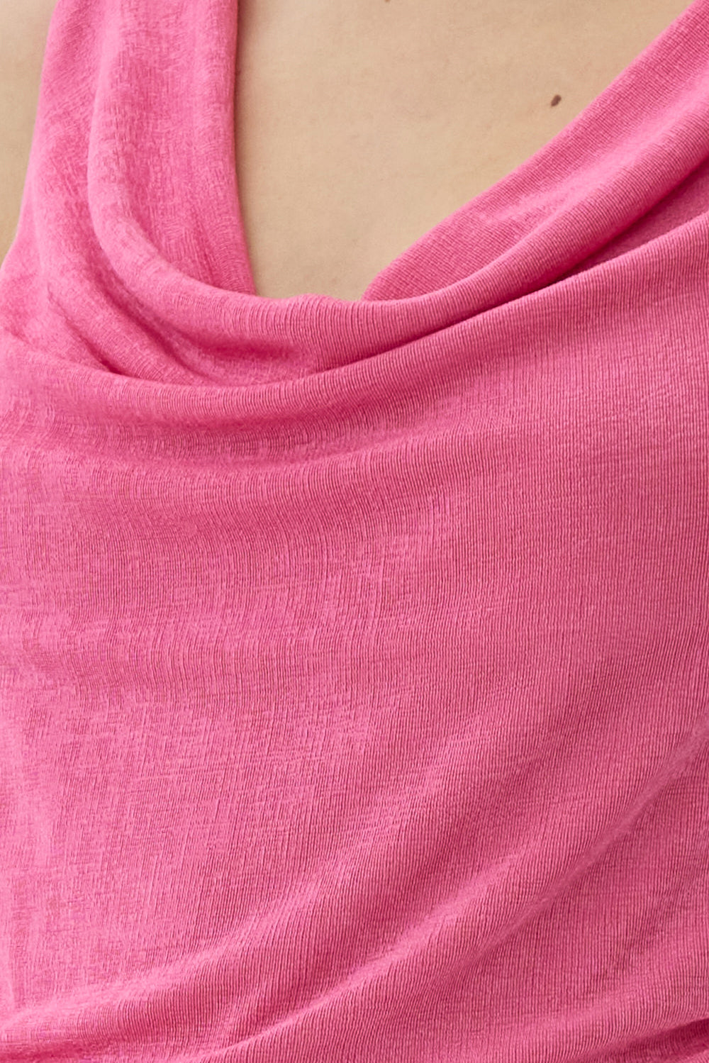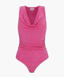 Velvety bodysuit installed with a dramatic cowl neckline. The sides are taken in to give the body a draped texture.