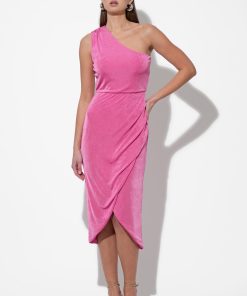 This captivating midi dress in a vibrant pink hue features a luxurious, subtly textured knit fabric that drapes beautifully. The elegant one-shoulder design creates a chic and modern silhouette, while the ruched detailing at the waist enhances the figure.
