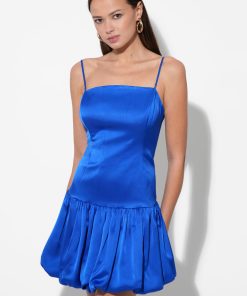 This dress captivates with its rich sapphire hue and luminous sheen. It features delicate, adjustable spaghetti straps framing a modern square neckline, leading to a meticulously tailored bodice that accentuates the silhouette. The dress culminates in a dramatic, couture-inspired bubble hem, lending an air of playful grandeur.