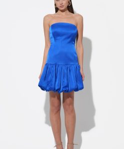 This dress captivates with its rich sapphire hue and luminous sheen. It features delicate, adjustable spaghetti straps framing a modern square neckline, leading to a meticulously tailored bodice that accentuates the silhouette. The dress culminates in a dramatic, couture-inspired bubble hem, lending an air of playful grandeur.