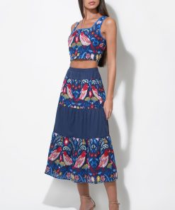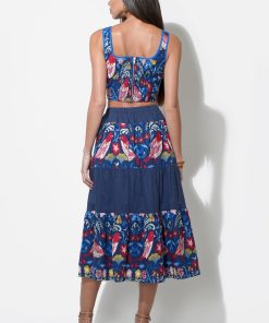 This delightful midi skirt features a vibrant bird and floral print in a rich palette of blues, reds, and greens, accented by a contrasting solid blue tiered panel. The comfortable elasticated waist ensures a perfect fit, while the flowing tiered silhouette adds graceful movement. Perfect for creating a effortlessly stylish look, this skirt combines intricate embroidery with a relaxed, comfortable design.