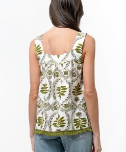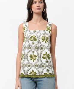 A fresh take on sunny-day style. The Roy Top features a leafy green print on a lightweight cotton blend, designed with a flattering square neckline and wide shoulder straps. Pintuck pleats add a soft touch of volume, while the fringe trim at the hem gives it a playful finish. The relaxed fit pairs effortlessly with denim or a crisp white skirt.