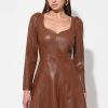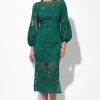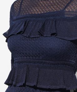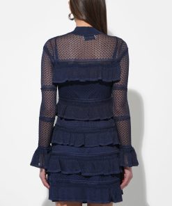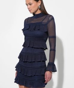 It is crafted from a navy blue fabric with a delicate open knit, see-through pattern on the upper bodice and sleeves. The dress features a mock turtleneck, a fitted bodice with ruffled tiers, and a tiered mini skirt that creates a playful, flounced silhouette.