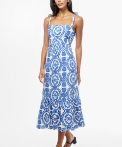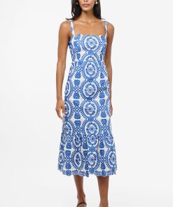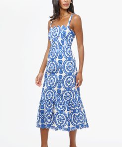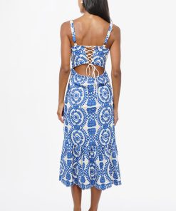 Make a statement in the Shanna Midi Dress, where intricate embroidery meets an effortless silhouette. This dress features a flattering square neckline and adjustable straps, with a stunning open-back design that’s laced up for a custom fit. The embroidery is imagined in a bold blue and the skirt is adorned with a flared hem.