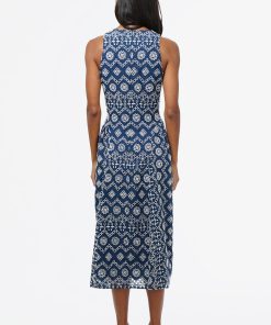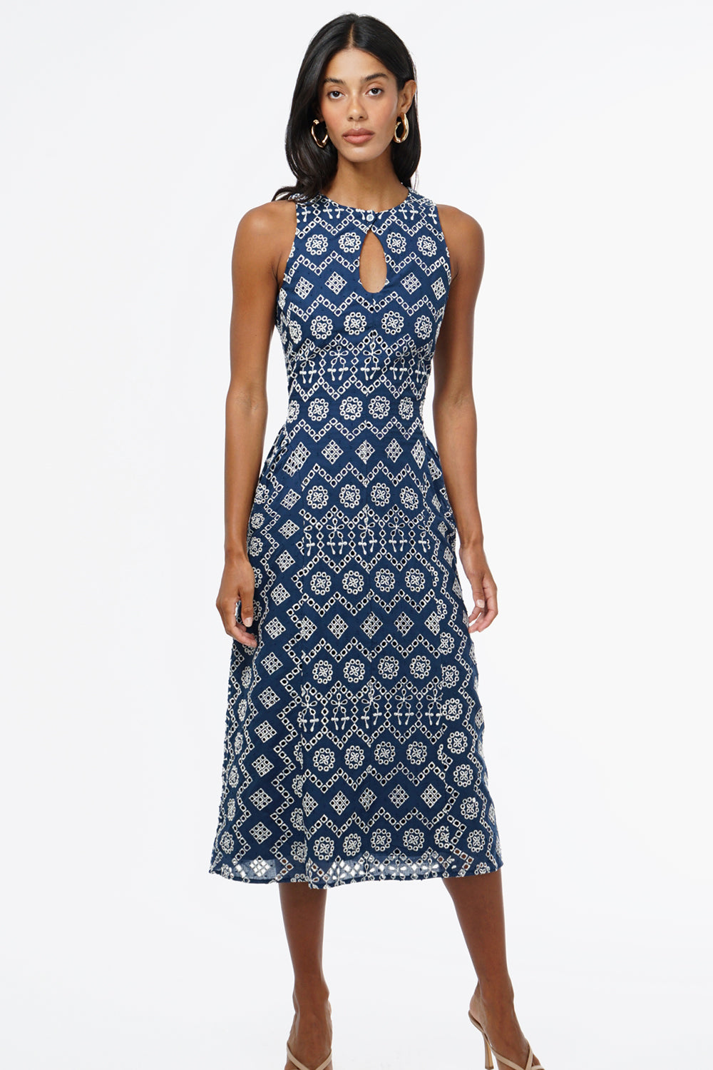 The Soraia Dress blends structure with softness in a navy cotton eyelet fabric, sculpting the waist and skimming the body with just the right amount of movement. The high neckline with a keyhole cutout adds a touch of drama, while the A-line silhouette keeps it wearable and refined.