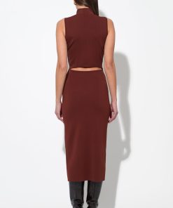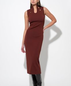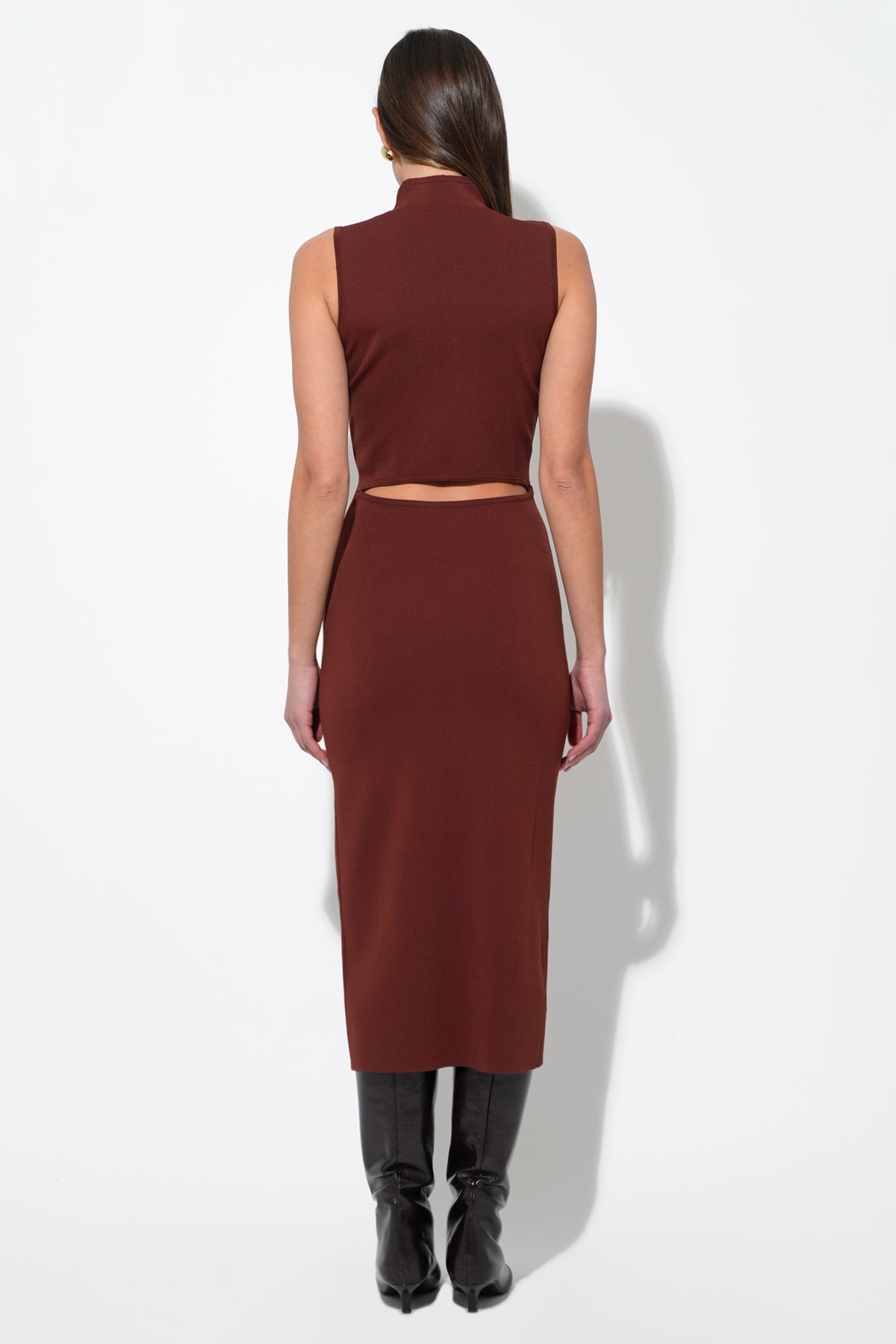 This elegant midi dress is crafted from a luxurious, figure-sculpting ribbed knit fabric in a rich chocolate brown hue, offering both comfort and a sleek silhouette. It features a contemporary high neckline and striking cut-out details at the waist, adding a modern and alluring edge.