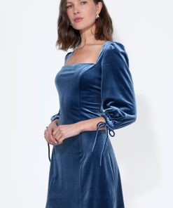 This stunning mini dress, in a delicate icy blue hue, is crafted from a luxurious, soft velvet fabric that drapes beautifully. The design features a chic halter-style neckline that creates an elegant silhouette.